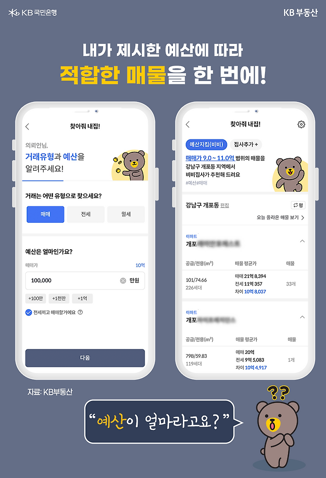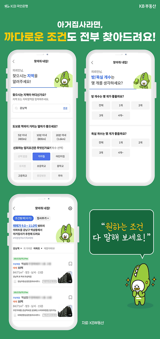 지금까지 오직 KB부동산에서만 만나볼 수 있는 ‘찾아줘 내 집!’ 서비스에 대해 알아봤습니다. 내가 만족할 만한 집을 구하는 것은 많은 시간과 비용이 할애되는데요. 여러분이 조금이라도 더 편하게 원하는 집을 마련할 때까지 KB부동산이 도와드리겠습니다.