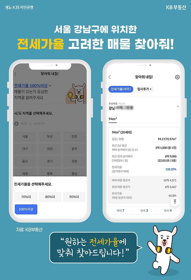 KB부동산 앱(홈페이지)에 접속한 후, 메뉴 항목을 보면 ‘찾아줘 내집!’이라는 콘텐츠가 있습니다. 찾아줘 내집이란 KB부동산의 마스코트인 집사들이 여러분이 입력하신 조건에 만족하는 집을 추천해주는 서비스인데요. ‘전세가율’, ‘예산지킴’, ‘조건탐색’, ‘내집분석’ 등 4가지 항목이 있습니다.