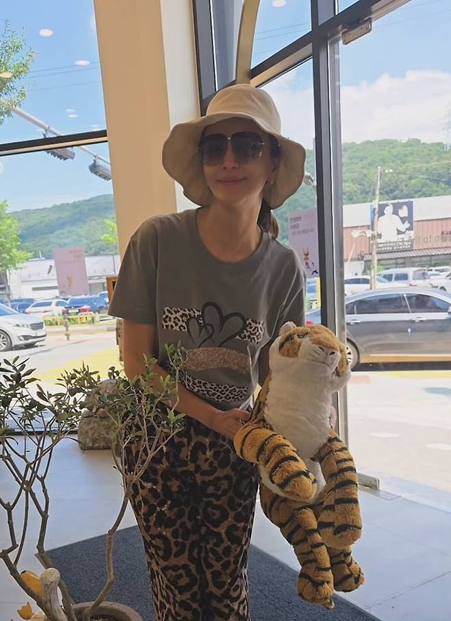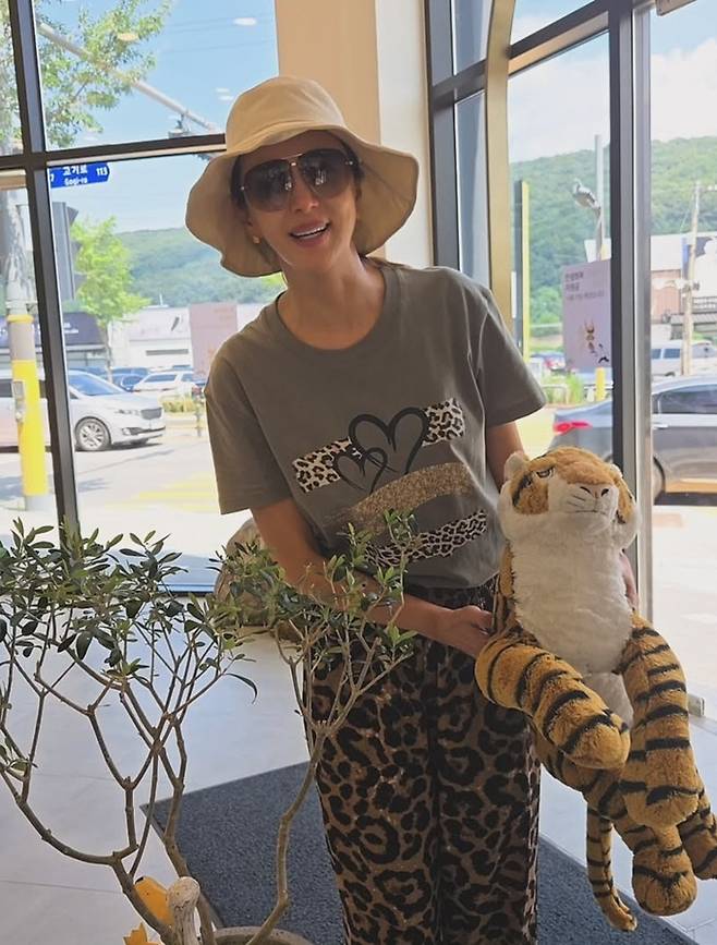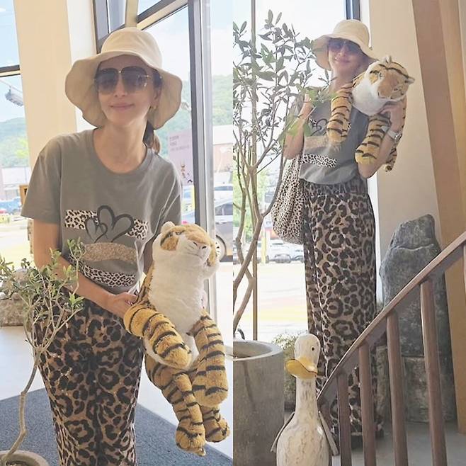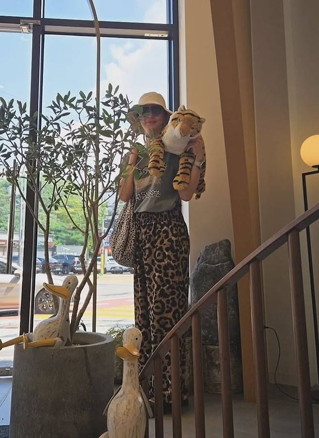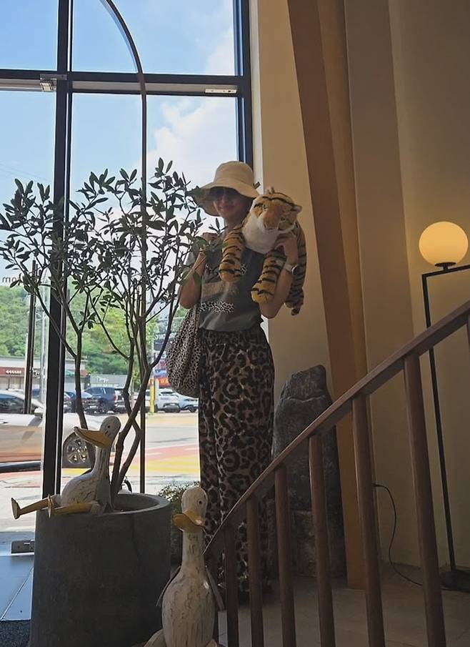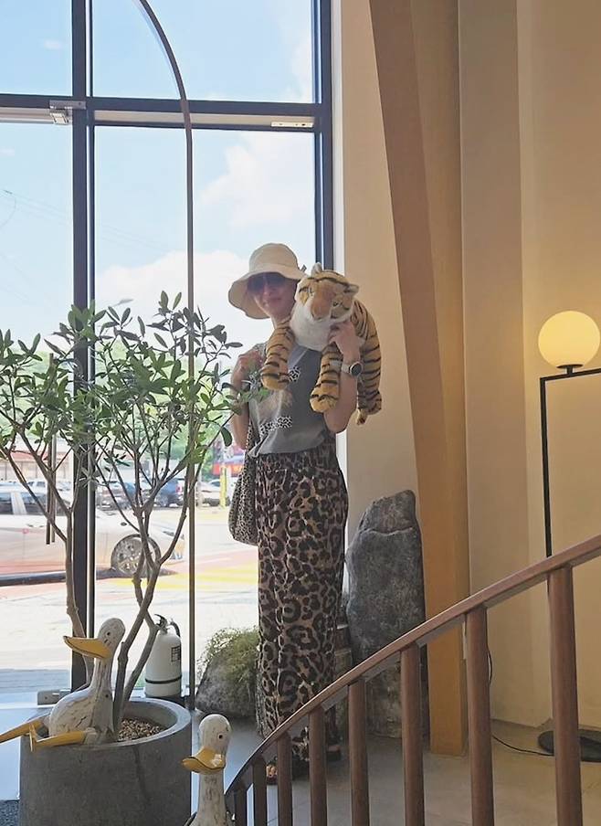 윤해영은 22일 자신의 채널에 “호피패션, 친한 언니랑 바지, 찌찌뽕, 카페 호랑이도 소환, 오늘도 덥네요”라는 글과 함께 카페 외출 사진을 게재했다.