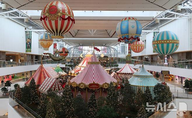 [서울=뉴시스] 김혜진 기자 = 1일 서울 영등포구 더현대 서울에 크리스마스 트리가 설치돼 있다.