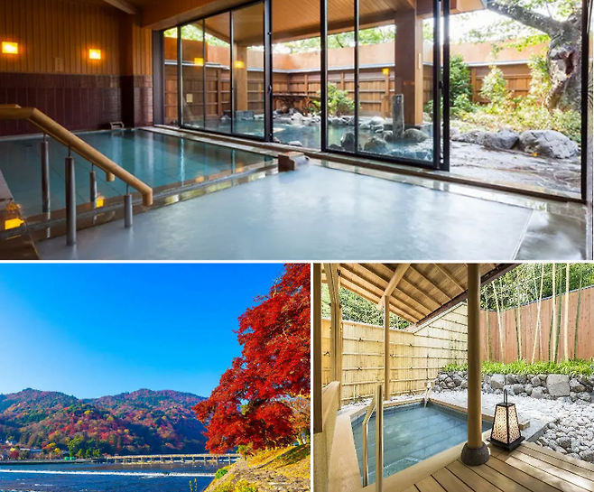 교토시 서쪽 끝에 위치한 아라시야마는 사계절 내내 수려한 풍광을 감상할 수 있는 장소로 1000년 이상 전부터 귀족들의 별장지였는데요. 100년쯤 전부터 2~3곳의 온천 료칸이 생겼지만 2004년에 새로운 원천을 찾아내 현재는 그 온천을 끌어온 숙박시설이 늘어났습니다.