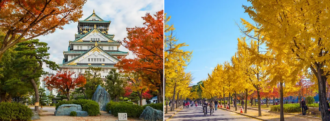 특히 오사카 성 공원 서쪽의 나시노마루 정원의 단풍은 매우 아름답습니다. 붉게 물든 약 300그루의 벚나무가 당당한 자태를 드러내는 오사카 성과 어우러져 중후함과 아름다움을 함께 즐길 수 있는데요. 노랗게 물든 은행나무 가로수길을 여유롭게 걸으며 산책하는 것도 큰 즐거움이죠.