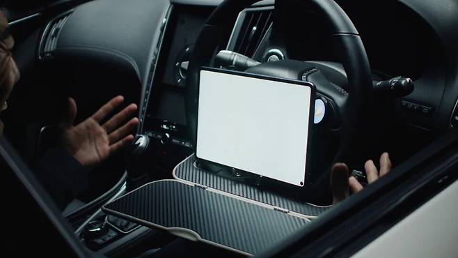 차 안에는 곳곳에 테이블을 마련했다. 테이블 중 하나는 비행기 비즈니스 클래스처럼 센터 콘솔에 수납할 수 있다. 탈착식 선바이저도 테이블로 변한다.