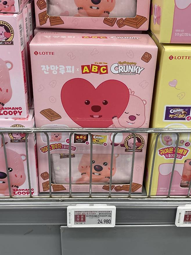 잔망루피 캐릭터를 활용한 서랍형 패키지로 발렌타인데이 매대에서 선물용으로 한눈에 들어오는 상품이에요.