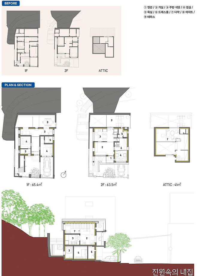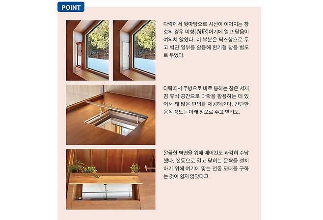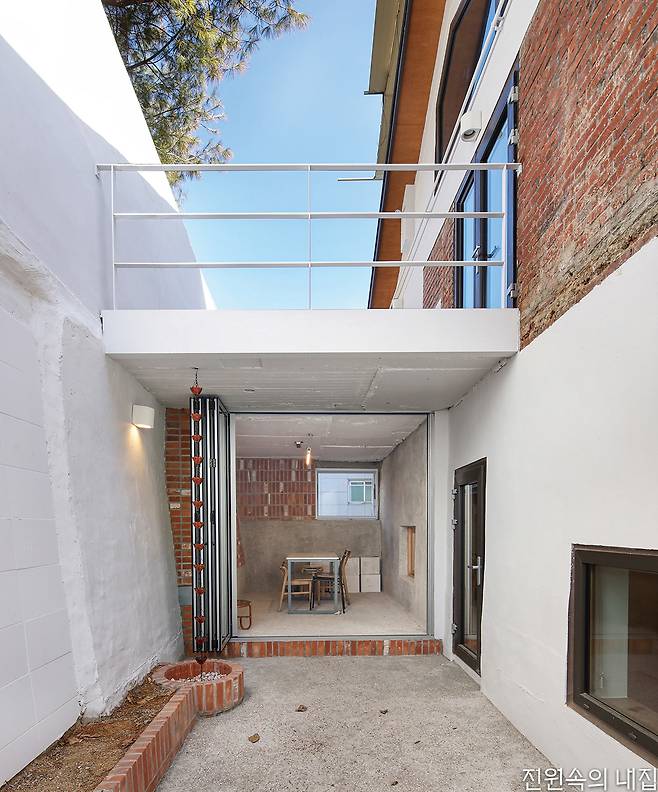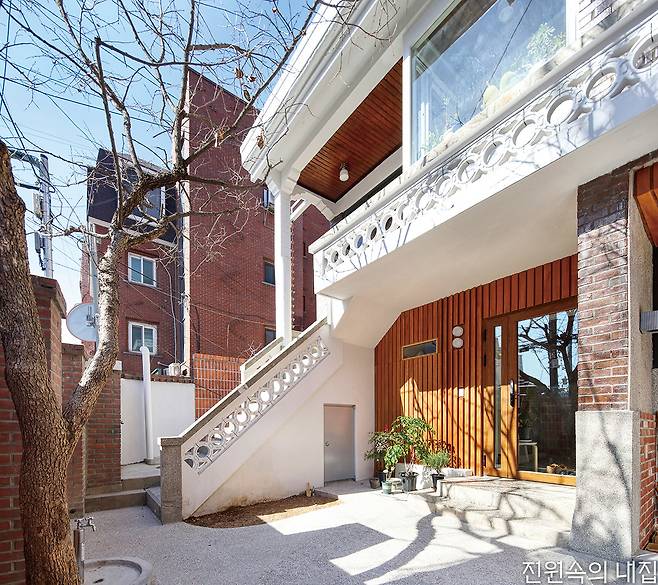 공사는 외부 정리부터 시작됐다. 전·후면의 불법 증축 부분을 철거하여 주차장, 마당, 테라스 공간을 확보했다. 또한, 기존 구조와 독특한 창문 디자인을 상당 부분 유지하여 옛 모습을 존중하면서도 건축 비용의 효율성을 높였다.