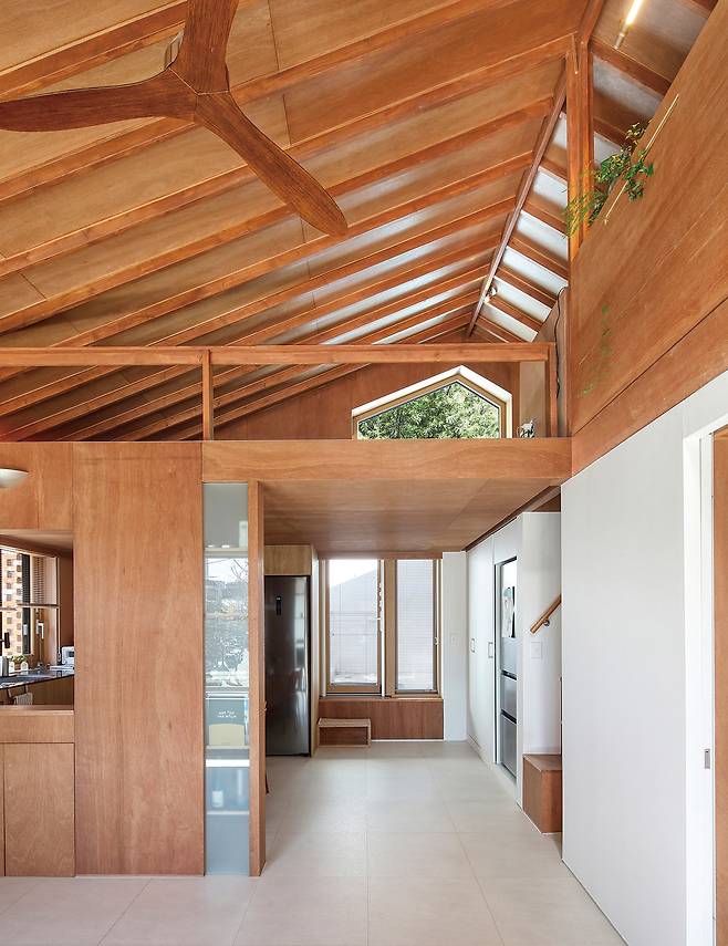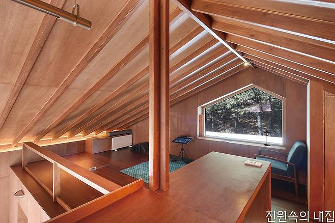 부부의 생활공간인 2층과 다락은 지붕선까지 천장을 오픈해 넓고 개방감 있는 공간으로 만들었다. 기존에 벽으로 세분화되어 있던 공간을 ‘주방 겸 식당’, ‘거실’, ‘부부 침실’로 통합하여 답답함을 줄였다. 특히, 다락은 리모델링을 통해 가장 극적으로 변한 공간으로, 취미실, 서재, 작업실 등 다양한 용도로 활용되며 가족들에게 사랑받는 공간이 되었다.