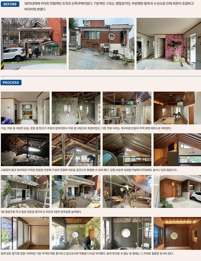 이 집은 1974년에 준공된 전형적인 단독주택이었다. 정 소장이 보기에 구조적으로 큰 문제는 없었지만, 오래된 건물인 만큼 내부가 좁고 복잡했으며, 무단 증축과 수선으로 덧댄 공간들이 어수선하게 얽혀 있었다. 그러나 불필요한 부분을 걷어내고 정리하면 매력적이고 실용적인 공간이 될 가능성이 컸다.