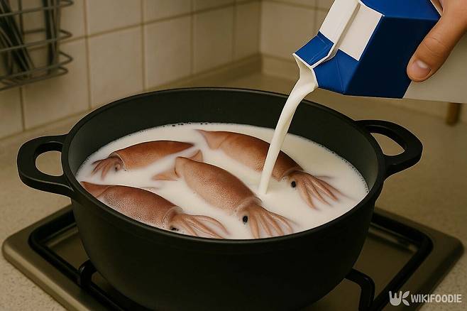 데치기 전 10~20분간 우유에 담갔다가 꺼낸 오징어는 삶는 도중에도 수분 손실이 적고, 잡내가 줄어든다. 우유 속 유당과 지방이 비린내를 흡착해 오징어 특유의 향을 잡아주기 때문이다. 삶는 물에 소량의 우유를 함께 넣어도 비슷한 효과를 얻을 수 있다.