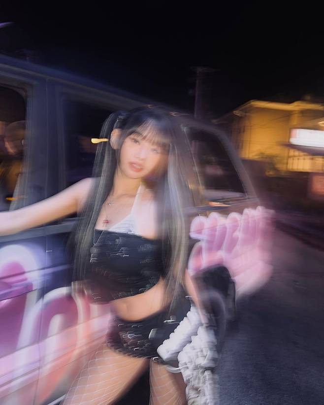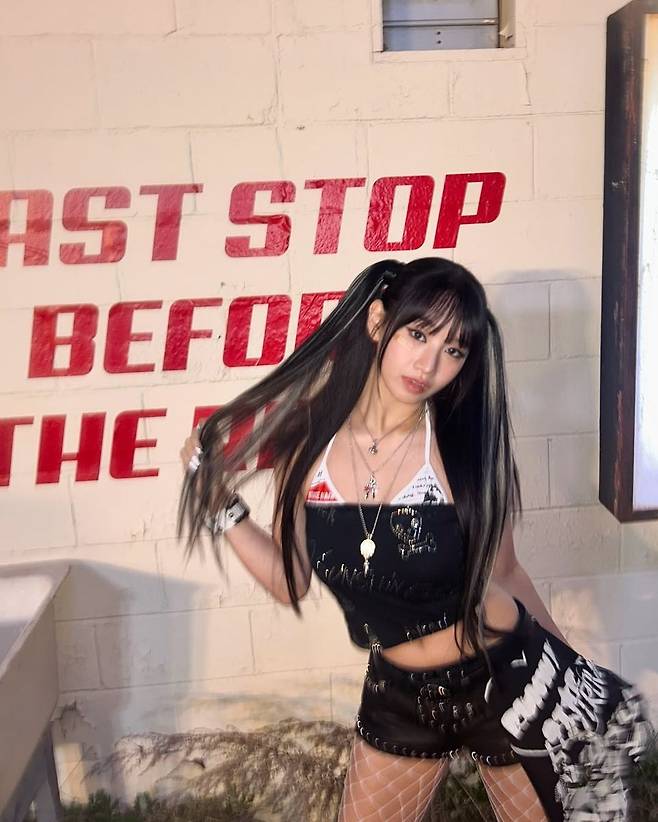 하의는 레터링이 돋보이는 블랙 스커트에 프린트된 밴다나를 덧대어 Y2K 감성을 강조했고, 화이트 망사 스타킹과 플랫폼 워커는 다리를 더욱 길어 보이게 만드는 동시에 섹시하면서도 쿨한 분위기를 완성했다. 일부 팬들은 “진짜 2000년대 비쥬얼 잡지 찢고 나왔냐”, “23살 감성 미쳤다”라는 댓글로 열렬한 반응을 보였다.