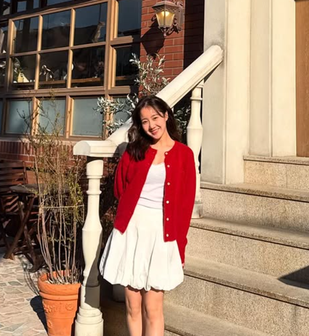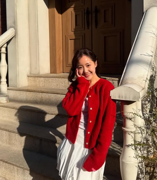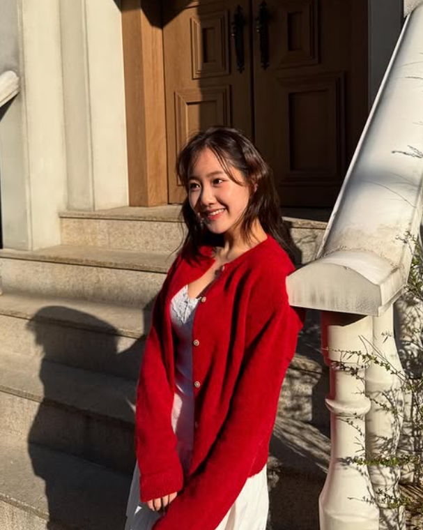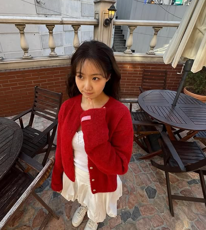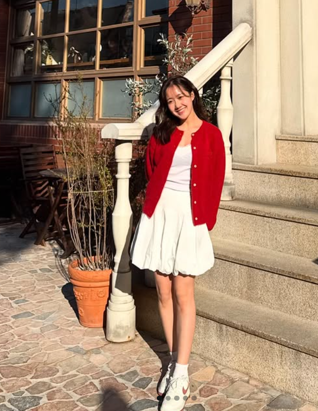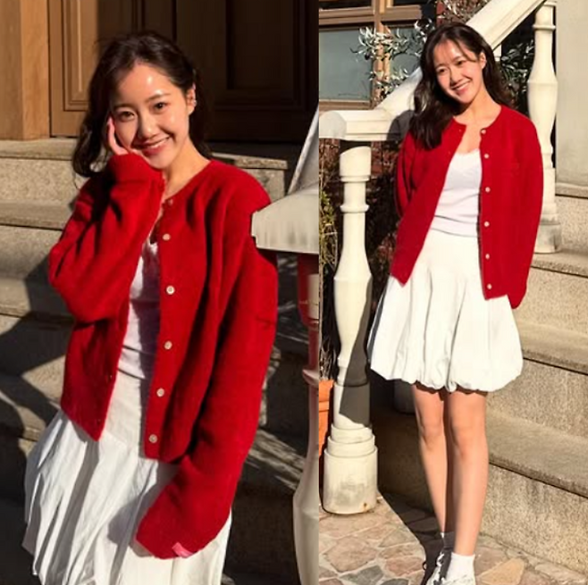 배우 진지희 님이 선보인 이번 코디는 ‘여친룩’의 정석이라 불릴 만한 사랑스러운 분위기가 가득한 스타일이었어요. 선명한 레드 컬러의 니트 가디건과 깨끗한 화이트 톤의 이너와 벌룬 스커트 조합은 단순한 듯하면서도 발랄하고 감각적인 스타일링을 보여주었죠.