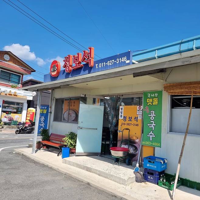 시원하게 갈린 얼음이 가득 올라간 진한 콩국수 곡성 '청보석'. 밭에서 직접 기른 콩을 재배해 만든 콩물이라 그 진한 맛이 일품이다. 소금이 적당히 들어가 있는 콩국수는 취향에 맞게 설탕이나 소금을 더 넣어서 먹어도 좋다. 원래는 중국집이었지만 남자 사장님이 돌아가신 후 기술을 배워 여자 사장님 혼자 국수를 만드신단다. 그래서인지 콩국수에 짬뽕면을 사용하여 쫄깃한 식감이 남다르다. 콩국수와 잘 어울리는 묵은지 또한 사장님이 직접 담가 어디서도 맛보기 힘든 귀한 맛이다.