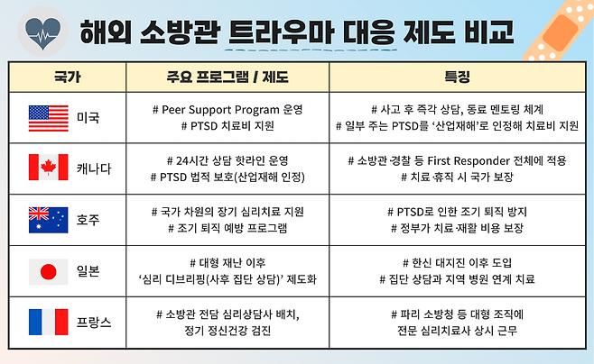 미국은 2001년 9·11 테러 이후 소방관과 경찰 등 재난 대응 인력을 위한 정신건강 프로그램을 20년 넘게 운영하고 있다. 대표적으로 ‘피어 서포트(Peer Support)’ 제도를 도입해 현장 충격을 경험한 대원이 즉시 동료와 심리적 경험을 공유하며 치유할 수 있도록 돕는다. 루이지애나 등 일부 주에서는 PTSD를 산업재해로 규정해 치료비와 상담 비용을 주정부가 지원하고, 필요할 경우 장기 휴직도 보장한다.