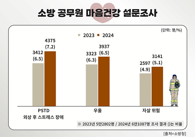 이처럼 대형 참사 현장에 출동했던 소방관들은 우울증과 PTSD 등 정신 질환을 앓고 있는 비율이 높다. 지난해 소방청이 소방관 6만1087명을 대상으로 진행한 ‘소방공무원 마음 건강 설문 조사’를 실시해 보니 3141명이 자살 위험군에 속하는 것으로 조사됐다. 이는 2597명이던 전년 대비 약 0.3%p 증가한 수치다. PTSD를 겪는 소방관은 4375명, 우울증을 겪고 있는 소방관은 3937명으로 각각 전년보다 0.5%p, 0.2%p 상승했다.