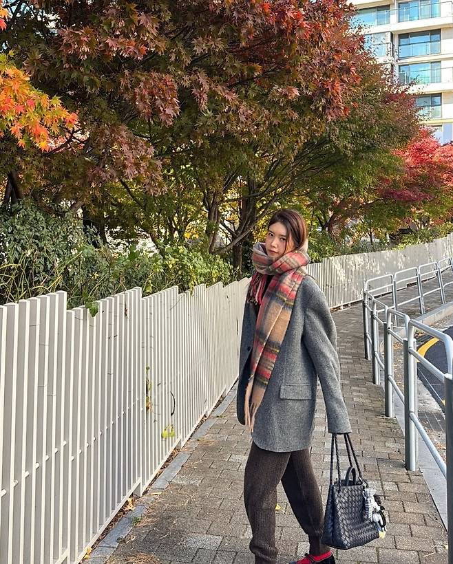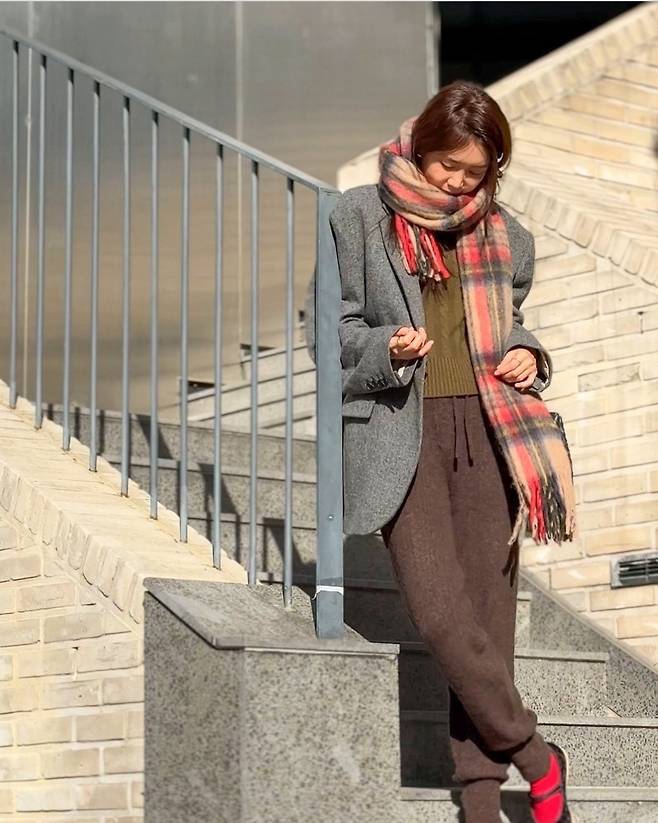 채정안은 브라운 계열의 니트 팬츠와 그레이 블레이저 코트 조합을 선택해 클래식하면서도 편안한 캐주얼룩의 정수를 선보였습니다.