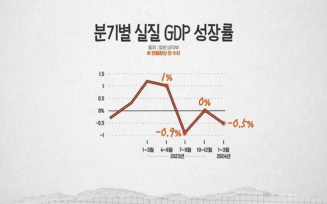 수치를 봐도 금리를 올리기 굉장히 어려운 상황이거든요. 이 경제 성장률을 보면요. 2023년 2분기에 일본이 1% 성장을 했습니다. 그런데 3분기에는 -0.9%로 역성장했거든요. 4분기에는 다시 0%로 올라왔어요. 그러다가 올해 1분기 2024년 1분기에는 다시 -0.5%가 됐습니다. 그러니까 올라갔다 내려갔다 올라갔다 내려갔다 이러고 있는 겁니다. 이거를 더블딥이라고 하거든요. 두 번 마이너스가 된 거죠. 이렇게 더블딥에 빠진 경제는 장기적으로 경기 침체에 빠질 가능성이 있다고 이야기합니다.