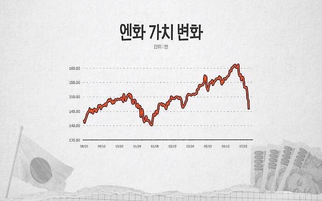 그런데 문제는 뭐냐 하면 그렇게 예상한 근거가 달러당 엔 환율이 한 140엔대 후반에서 150엔대 정도를 유지할 경우였거든요. 우리가 8월 5일에 봤습니다만 달러당 141까지, 140엔대 초반까지 엄청나게 빠른 속도로 엔화 가치가 급등했습니다.