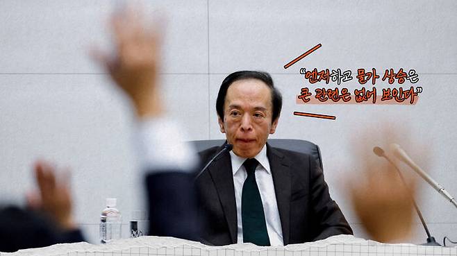 실질적으로 일본은행이 정치적 압력을 받았나 안 받았나를 보면 일본은행 우에다 총재의 발언 내용이 미묘하게 바뀌거든요. 4월 26일 금리 정책 결정 회의를 하고 나서 우에다 총재가 기자회견을 합니다. 그때 기자들이 ‘이렇게 슈퍼 엔저가 지속되면 수입 물가가 폭등해서 서민들이 물가 때문에 엄청나게 생활이 힘든데 금리를 좀 올려야 되지 않냐’라고 묻자, 우에다 총재가 ‘엔저하고 물가 상승은 큰 관련은 없어 보인다’ 이렇게 얘기를 했습니다. 올리지 않겠다는 뜻이죠.