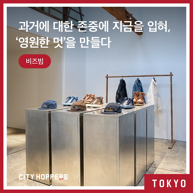 똑같이 낡았지만 다른 힘을 가진 두 부츠. 비즈빔의 창업자 ‘나카무라 히로키’에게 어렸을 때부터 ‘멋’에 대한 화두를 던져준 물건이었어요. 이때부터 히로키는 오랜 시간이 지나도 낡지 않는 힘을 가진 물건, 더 나아가서 그런 옷과 신발을 만들고 싶어했어요. 그렇게 어린 시절의 부츠에서 영감을 받아, ‘영원히 신는 신발’이라는 모토를 가지고 2001년에 비즈빔 브랜드를 시작하게 되죠.