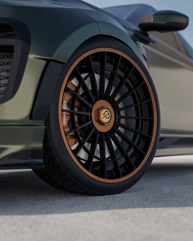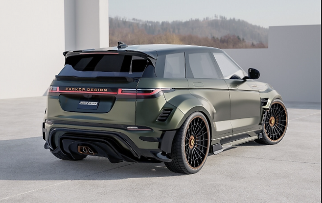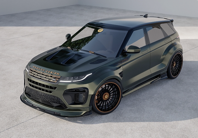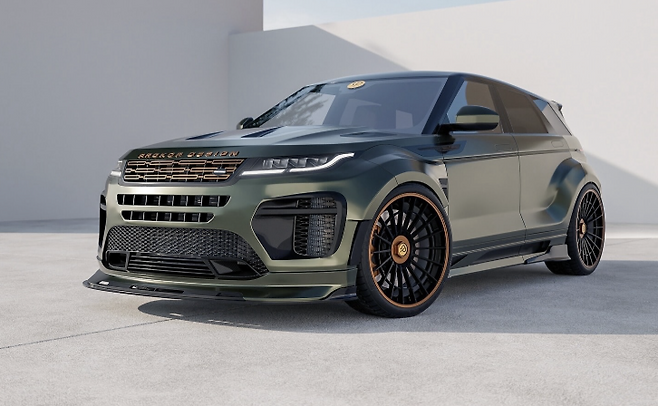 이런 가운데, 레인지로버 이보크를 더욱 매력적으로 재해석한 'GT-X' 렌더링이 공개됐다. 공개된 이미지를 보면, 새로운 이보크는 올리브 메탈릭 색상에 투명 코팅을 입히고, 블랙 액센트와 구리색 디테일을 더했다. 특히 듀얼톤 애프터마켓 알로이 휠의 일부에도 구리색 마감이 적용되었다. 낮아진 서스펜션과 더 커진 휠, 공기역학적 바디킷으로 와이드바디 스타일을 완성했다.