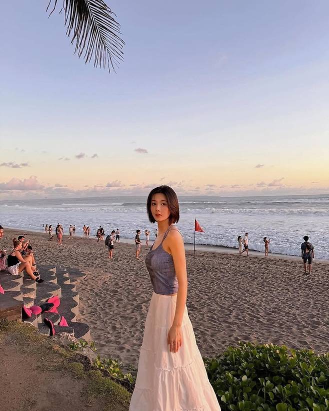 노을빛이 물든 해변, 따스한 햇살 아래 권은비가 인스타그램에 공개한 바캉스룩이 화제를 모은다. 잔잔한 파도와 야자수가 어우러진 이국적인 풍경 속, 그녀는 여름 감성이 물씬 풍기는 스타일링으로 이목을 집중시켰다.
