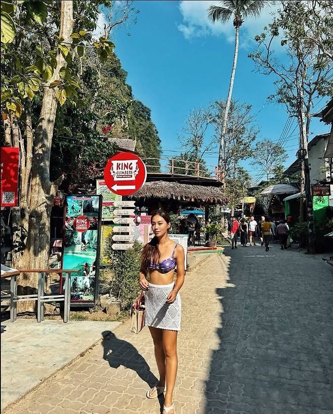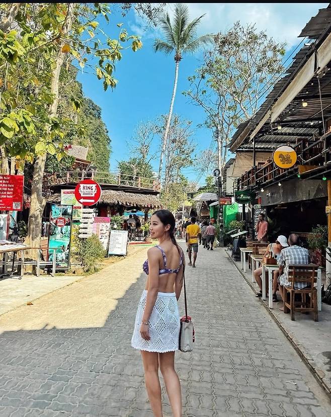 특히 김희정은 보라색 비키니 톱과 화이트 크로셰 미니스커트로 사랑스러운 휴양지 룩을 완성했습니다.