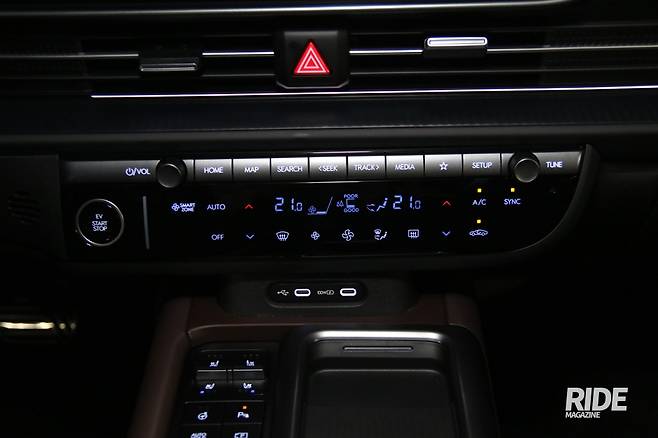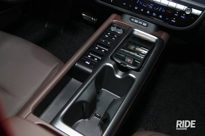 실내의 변화가 조금 당황스러운데, 다른 곳보다도 센터 콘솔에 모여있는 버튼들 때문이다. 주요 기능 버튼들을 모아놓긴 했지만 1세대 넥쏘가 떠오르는 건 나뿐인 걸까. 도어 쪽으로의 공간을 넓히기 위해 이곳에 버튼들을 모아놓은 건 이해하지만 너무 한곳에 많은 게 아닌가 싶은 생각도 든다. 옆으로는 스마트폰 충전 패드와 컵홀더 등을 배치해놓았다.