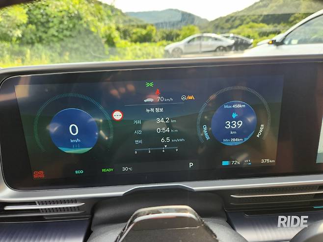 대략 살펴봤으니 이제 직접 달려볼 차례. 현대모터스튜디오 고양을 출발해 파주 카페를 다녀오는 왕복 약 80km의 코스다. 갈 때는 전비왕 선발대회를 한다고 해서 마음을 비우고 교통 흐름에 맞춰 달리기로 했다. 전비를 최대한으로 높이려면 에어컨까지 꺼야겠지만 아직은 그럴 수 있는 날씨는 아니니 에어컨과 통풍시트를 켜고 달리기 시작했다.