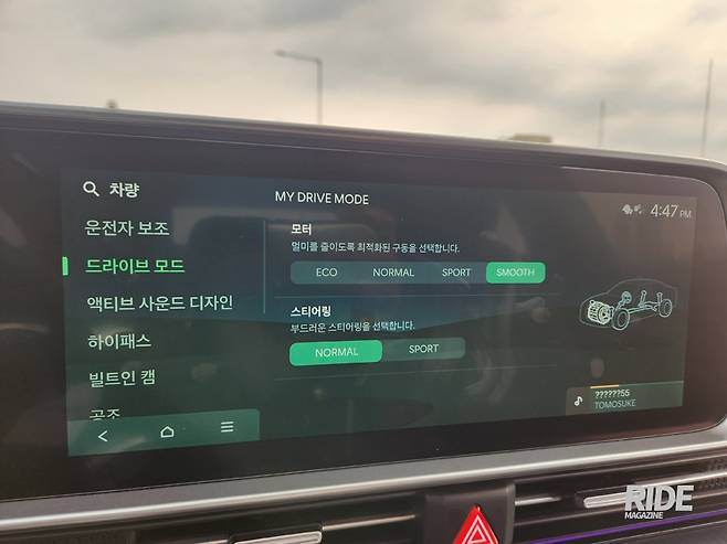 이번 신형에서 가장 주목할 변화 중 하나는 ‘스무스 모드’의 추가다. 전기차의 약점이라 할 수 있는 가속시의 울컥거림은 탑승자의 멀미를 유발하기 때문에 이로 인해 전기차를 부담스러워하는 사람들이 적지 않은데, 이번 신형에서는 울컥거림을 줄이는 스무스 모드를 도입했다. 이는 스티어링 휠의 드라이브 모드 버튼으로는 선택할 수 없고 마이 드라이브 모드로 들어가 별도로 선택해야 하는데, 가속감을 완화하고 정속 유지 편의성을 높였다는 것이 개발진들의 설명. 예전 하이브리드 자동차를 탔을 때 마치 뒤에 고무줄을 묶은 듯한 느낌의 가속감이 드는데, 스무스 모드를 직접 선택해서 주행해보면 비슷한 주행감을 느낄 수 있다. 여기에 가속 페달을 밟아도 다른 에코나 노멀, 스포츠 등의 모드보다 한 박자 늦게 가속되는 감각인데, 이 과정에서 울컥거림이 싹 사라지는 점이 마음에 든다. 가능하다면 무선 업데이트를 통해 드라이브 모드 버튼으로 선택 가능하게 변경해주는 것도 좋지 않을까 싶고, 가능하다면 다른 차량에도 업데이트를 통해 적용해주면 좋을 듯하다.
