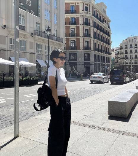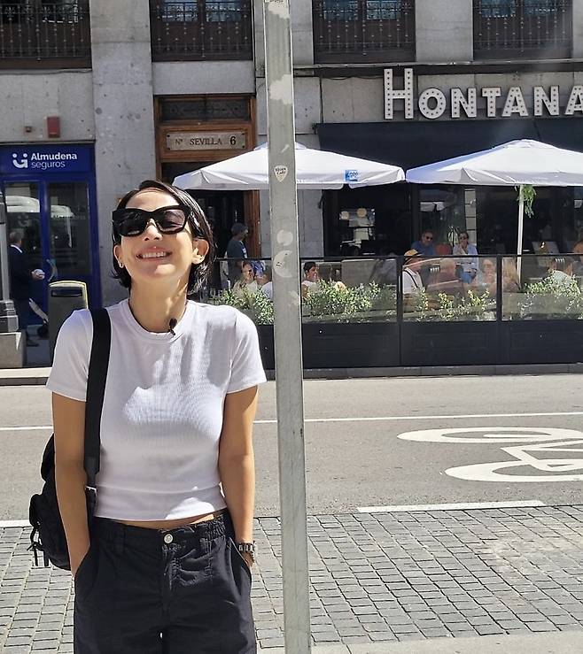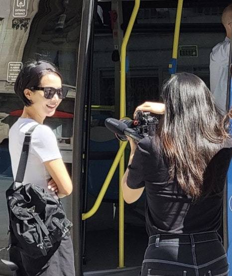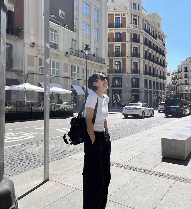 공항 사진에서는 흰 티셔츠나 원피스에 백팩을 멘 모습이 포착된다.