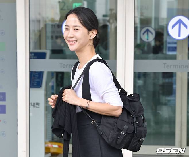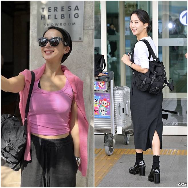공항 사진에서는 흰 티셔츠나 원피스에 백팩을 멘 모습이 포착된다.