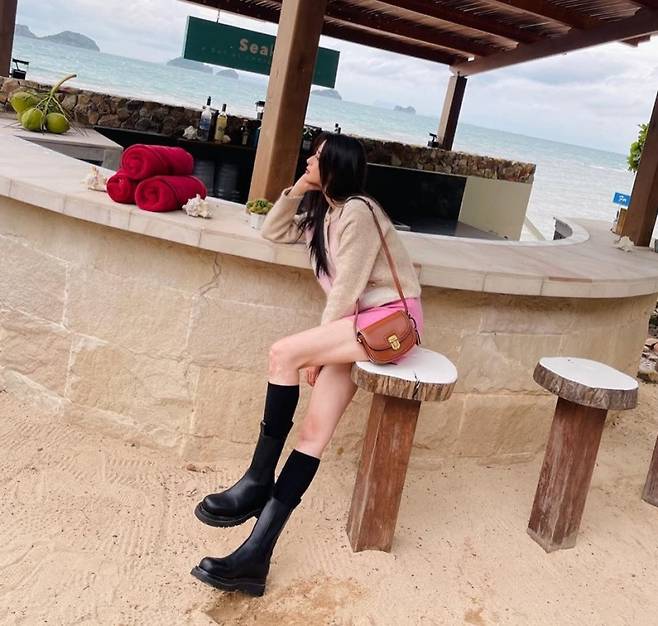 베이지 가디건에 핑크색 미니 스커트, 블랙 롱부츠를 신고 놀라운 다리 길이를 뽐냈는데요. 페미닌하면서도 세련된 느낌이 물씬 풍기죠? 💕