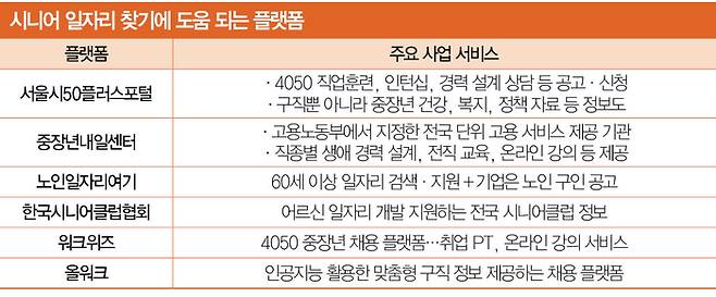 올해 초에는 노인 취업을 전문으로 돕는 ‘서울시니어일자리센터’도 새로 생겼다. 공공일자리를 중심으로 공급해오던 기존 방식에서 나아가, 60세 이상 시니어도 학력·경력 등을 반영해 민간 일자리를 제공하자는 것이 골자다. 시니어 전용 구인·구직 플랫폼인 ‘시니어 인력뱅크’에 프로필을 등록하면 60세 이상 채용을 원하는 기업과 실시간 매칭이 이뤄진다. 일대일 전문 상담뿐 아니라 실무 경험을 할 수 있는 ‘시니어 인턴십’, 재취업을 준비 중인 시니어 직무·산업별 커뮤니티 형성과 스터디를 목적으로 하는 ‘챌린저스클럽’ 등 프로그램을 마련했다. 서울시니어일자리센터 관계자는 “여러 현장 경험과 교육을 통해 고령층 시니어 자신감을 높이는 게 목표”라고 설명했다.