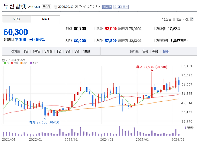 오늘(3/13) 종가 60,300원. 52주 고점 73,900원 대비 -18.4% 빠진 자리다. 52주 저점 40,800원 대비로는 +47.8% 올라왔다. 증권사 목표주가 평균 80,222원(+33.0%), 최고 88,000원(+46.0%), 애널리스트 9명 전원 매수 의견이다.