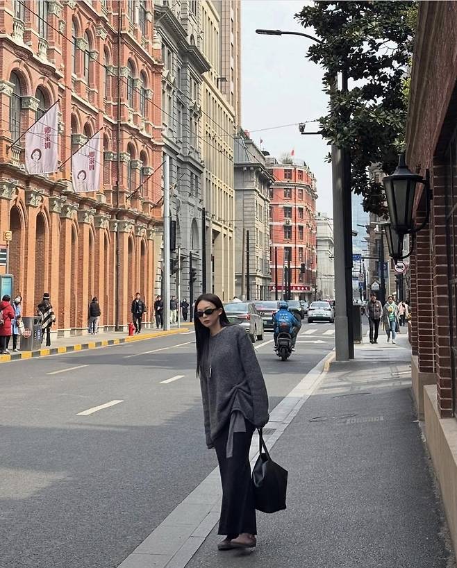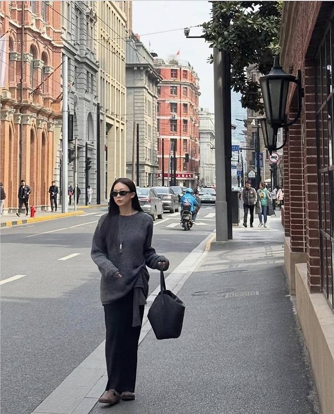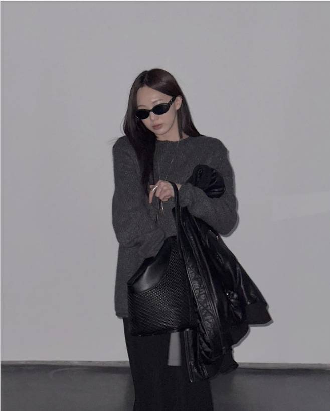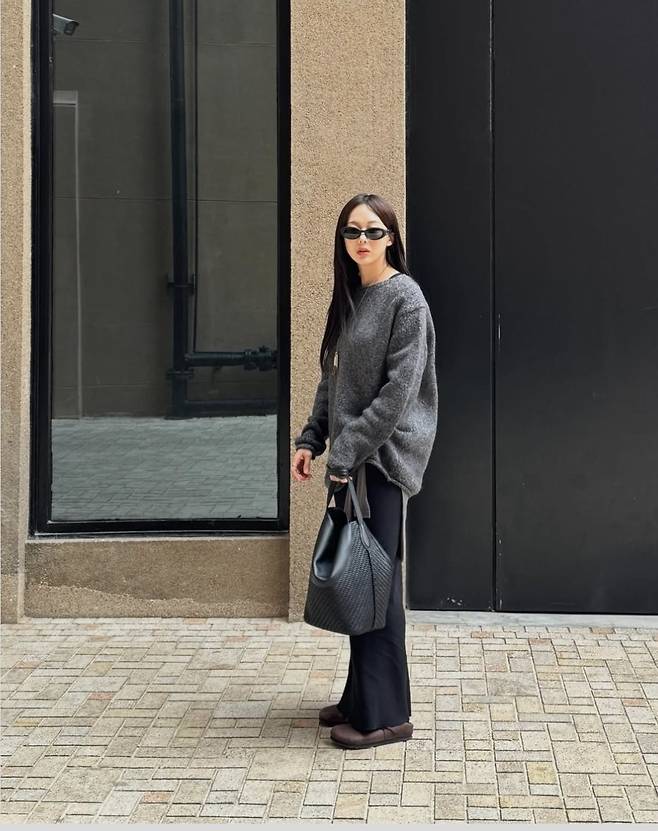 도톰한 다크 그레이 니트와 루즈한 블랙 팬츠의 조합은 편안하면서도 스타일리시한 느낌을 완성했습니다.