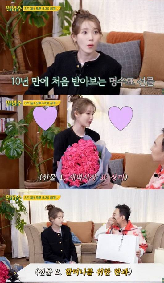 먼저 박명수는 새벽 꽃시장에 가서 직접 산 장미 꽃다발을 아이유에게 안겼으며, 특히 박명수는 아이유의 할머니를 위해 한과를 준비했다. 이에 아이유는 "눈물 날 것 같다"면서 생각지 못했던 박명수의 선물에 울컥하는 모습을 보였다.