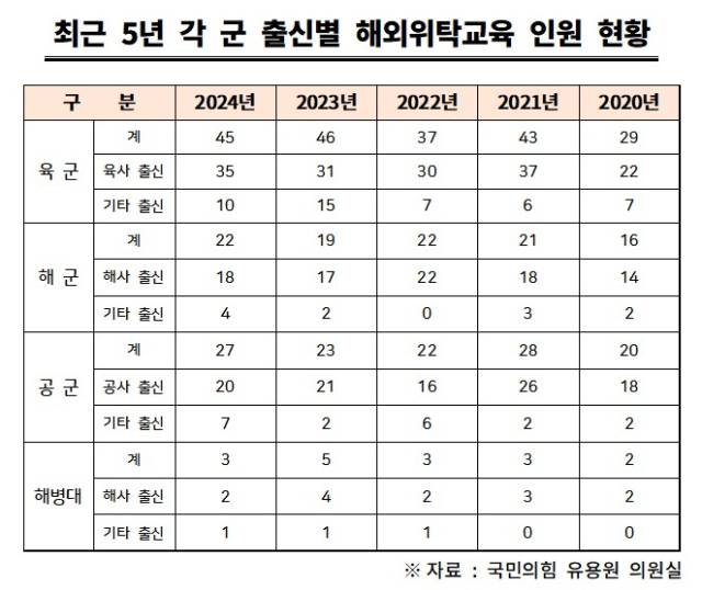 29일 국회 국방위원회 소속 국민의힘 유용원 의원실이 국방부로부터 제출 받은 ‘최근 5년 각 군 (장교)출신별 해외위탁(군사)교육 인원 현황’에 따르면 올해 6월말 기준 해외에서 위탁(군사)교육을 받고 있는 육·해·공군 군 장교 위탁생 436명의 82.1%인 358명이 육·해·공군 사관학교 출신인 것으로 나타났다.