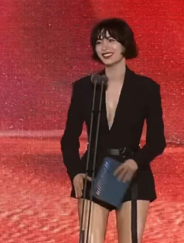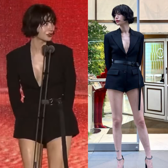 나나 님이 선택한 블랙 점프수트는 매우 짧은 숏츠 디자인으로, 그녀의 길고 예쁜 다리 라인이 돋보였어요. 숏츠 스타일은 강렬하면서도 세련된 느낌을 주며, 그녀의 완벽한 다리 라인을 강조하는 효과적인 아이템이었죠.