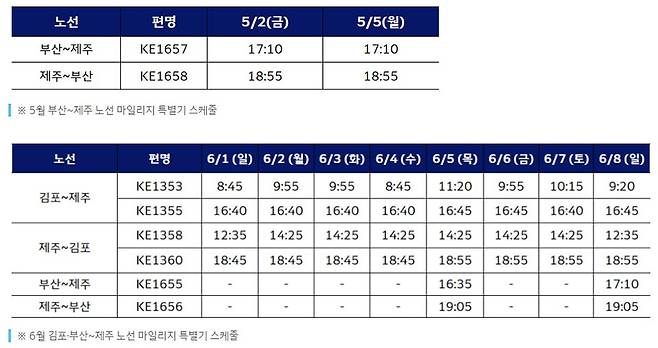 대한항공은 5월 황금연휴를 맞아 부산-제주 노선에 마일리지 특별기를 운영한다. 특별기는 5월2일과 5일 양일간 특정 시간대에 마일리지로 우선 발권할 수 있도록 했다. 특별기의 부산발 항공편은 김해공항에서 오후 5시10분 출발해 제주공항에 오후 6시10분 도착한다. 제주발 항공편은 제주공항에서 오후 6시55분 출발해 김해공항에 오후 7시55분에 도착하는 일정으로 운영한다.