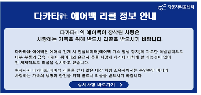 자동차안전연구원 자동차리콜센터는 지금도 '다카타社 에어백 리콜 정보'를 아래와 같이 안내하고 있다.