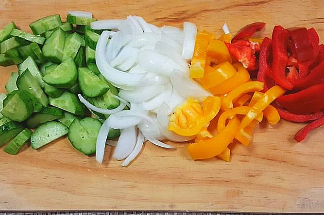 먼저 야채들을 먹기 좋게 썰어줍니다. 색깔피망 대신 당근을 넣으셔도 됩니다.