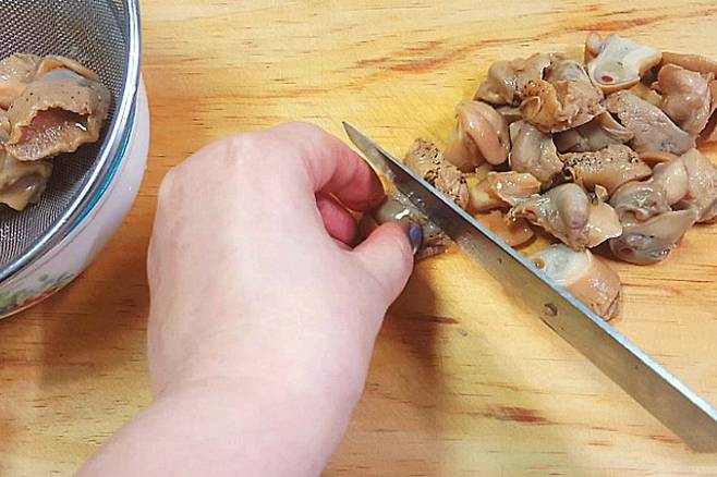 캔 골뱅이는 체에 걸러 국물을 제거하고요 한입 크기로 먹기 좋게 썰어줍니다.