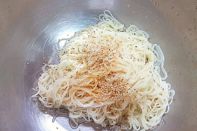 소면에 간장 1스푼, 참기름 1스푼, 깨 1스푼 넣고 가볍게 무쳐주세요. 이제 소면과 골뱅이무침을 접시에 담아내면 완성!
