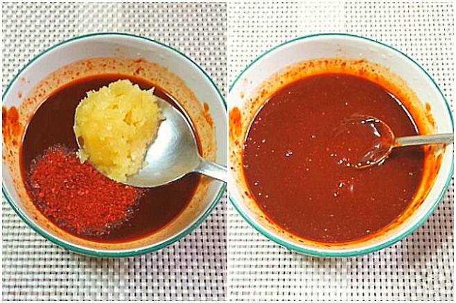 고추장, 설탕, 식초를 1:1:1로 잘 섞은 뒤 고춧가루 1스푼, 다진 마늘 1/2스푼을 넣고 잘 섞어주세요 (참기름과 깨는 나중에!)
