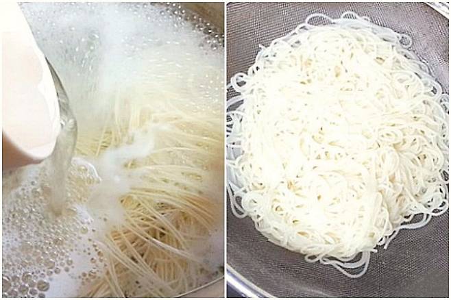골뱅이 무침에 빠지면 서운한 소면은 끌은 분에 1인분을 넣고 삶아 주시돼 물이 끓어오르면 찬물을 부어주세요. 이 과정을 2-3번 해주면 면이 탱글탱글해져요. 다 삶으면 바로 찬물이나 얼음물에 헹궈서 체에 밭쳐 물기를 제거합니다.