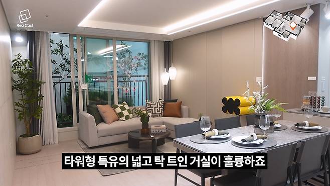 B타입 구성도 좋습니다. 타워형 특유의 넓고 탁 트인 거실이 훌륭하죠. 주방과 거실이 같은 공간에 있어 가족적인 느낌이 한층 더하는 평면입니다.