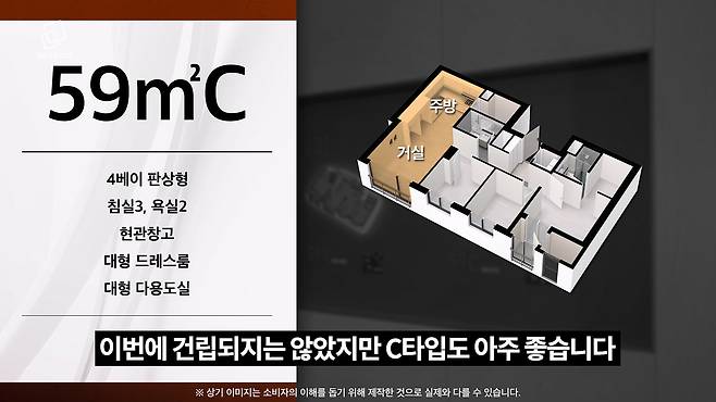 넓은 다용도실과 현관창고가 적용됐고, 드레스룸도 아주 넓습니다. A타입과 마찬가지로 수납에 아쉬움은 없겠습니다.