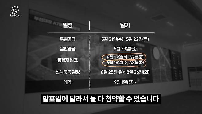 당첨자 발표는 A7블록 6월 17일, A8블록 6월 18일입니다. 발표일이 달라서 둘 다 청약할 수 있습니다. 8월 25일~26일 선택품목 결정 후 계약은 9월 1일부터 시작됩니다.