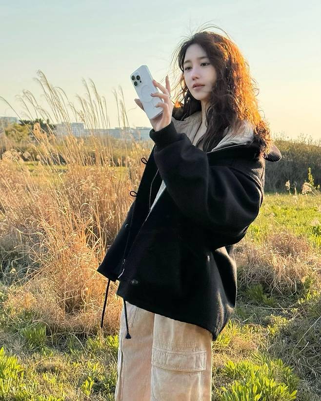 빛을 머금은 자연 배경과 어우러진 이지아의 표정과 실루엣이 룩 전체에 감성적인 깊이를 더해줬어요.