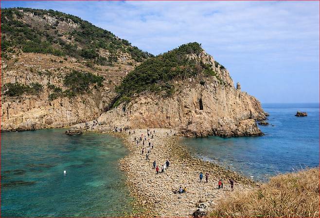 소매물도 여행에서 가장 특별한 장면은 바로 바닷길이 열리는 순간입니다. 소매물도 본섬과 등대섬 사이에는 약 70m 정도의 바다 구간이 있습니다. 평소에는 물에 잠겨 있지만 썰물이 되면 몽돌로 이루어진 길이 모습을 드러냅니다. 이 길을 열목개라고 부릅니다.