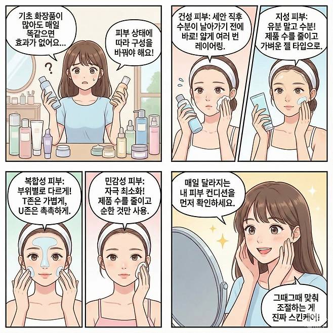 기초 화장품을 다양하게 갖추고 있어도, 매일 똑같이 바르기는 쉽지 않다. 바르는 제품을 그때그때 달리 해봐도, 피부가 좋아졌다는 느낌이 들지 않는 경우가 많다. 결국 중요한 건 제품의 종류가 아니라, 피부 상태에 따라 구성을 변경하는 데 있다.